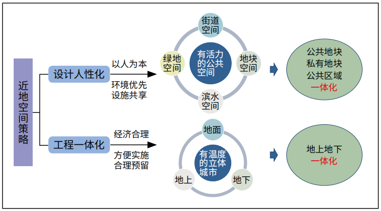 立体城市通过近地空间设计(图4),构建多维度的活动界面,实现城市从二维平面向三维立体的转型。立体城市竖向分层功能明确:地上层以绿化、人行、商业等公共活力城市基面以及城市消防救援体系为主,地面及地下层以机动车、地铁、市政管线等交通系统和市政设施配套为主。通过构建网络化、立体化、特色化的近地空间系统,实现从城市的“地下空间”向地下的“城市空间”转变,达到节约成本、提升效率、优化交通、共享设施与土地增效的目的。