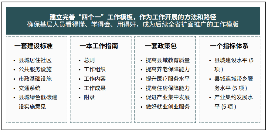 由此,提出以下工作路径:将“以人为本”作为贯穿就地城镇化的主线,把握“人口回流、产业回迁”两个趋势,培育县城发展内生动力;聚焦县城发展的“人、产、城”问题,找准“聚人口、育产业、优空间、强功能”4大切口,推动县城高质量发展;构建“四个一”工作模板,制定涵盖居住社区、公共服务、交通系统等内容的“一套建设标准”,推进县域协同发展的“一本工作指南”,覆盖教育、医疗、养老服务等领域的“一套政策包”,以及多维度评价县城建设、产业集约发展、连城带乡服务水平的“一个指标体系”(图5)。目前,县城发展已实现4大转变,即人口由外流逐步向县城集聚转变、城镇建设由低质低效向宜居宜业转变、产业发展由粗放分散向培育根植性主导产业转变、城乡发展模式由自发失衡向融合协调转变。