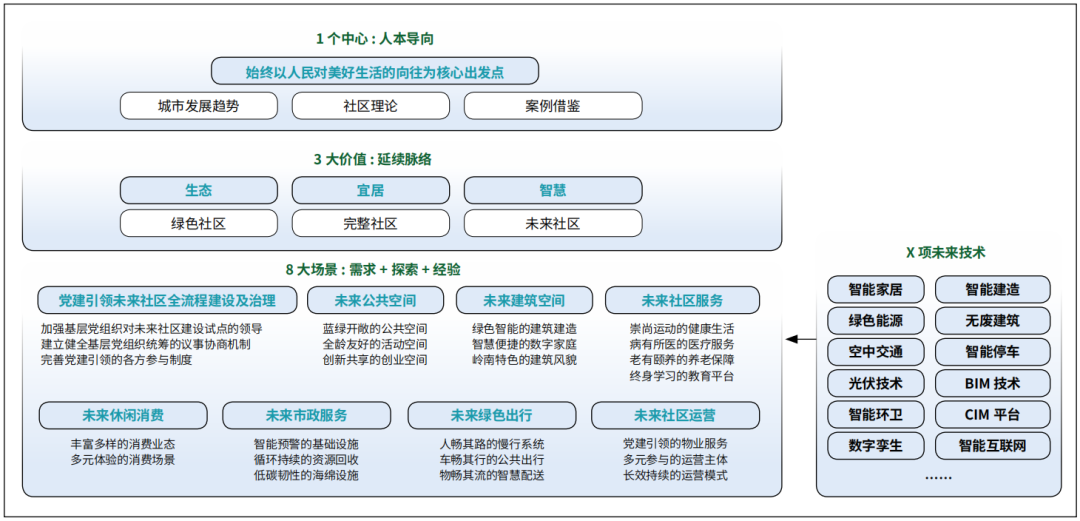 同时,持续推进未来社区建设探索,始终以人民对美好生活的向往为核心出发点,锚定“生态、宜居、智慧”3大价值导向,围绕社区居民全生活链服务需求,明确试点范围及规模要求,设置31个梯度指标,分三批试点滚动推进建设;构建“1个中心+3大价值+8大场景+X项未来技术”建设内容体系(图6);强化党建引领全流程建设管理机制,营造全龄友好与创新共享公共空间,凸显绿色低碳与岭南特色建筑风貌,配套智能友好全链条生活服务功能,构建多元参与和长效持续运营体系,着力将社区打造为空间布局合理、功能配套完善、治理高效协同的新型城市功能单元。