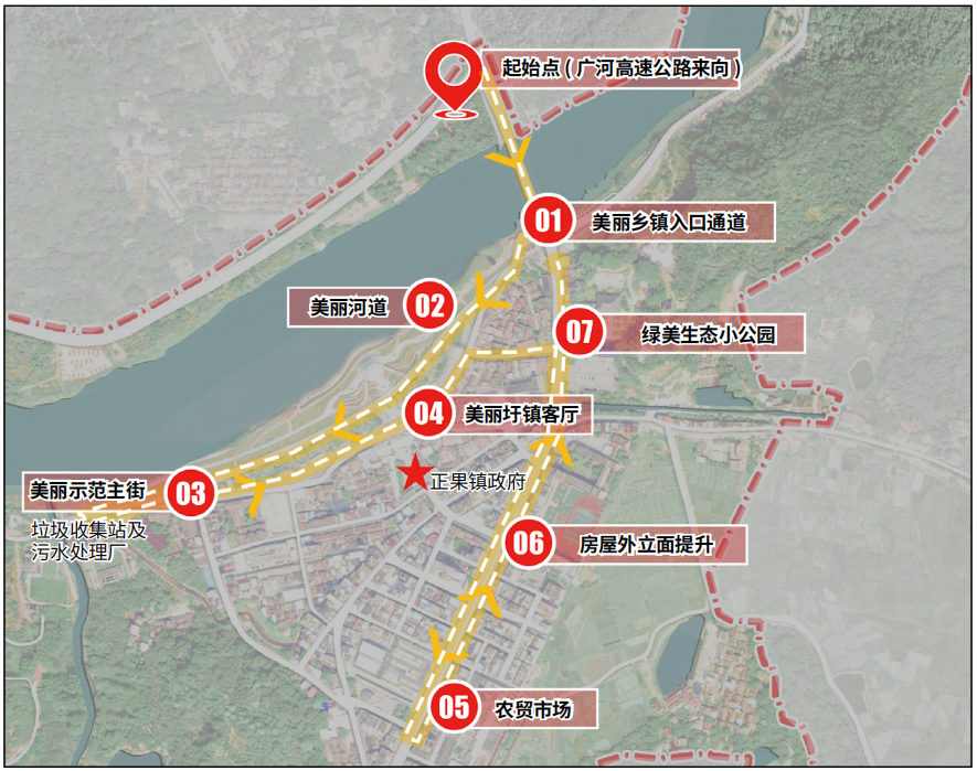 在“百千万工程”政策导向与项目建设逻辑的实践框架下,小城镇建设需构建“规划—项目策划—运营”三位一体的实施路径。一是规划引领,聚焦区域协同与差异化发展,形成主题鲜明、特色突出的项目集群;二是项目策划强调要素整合,发挥本土资源优势,打造地方特色品牌,积极探索“财政资金 + 社会资金”等多元化投融资模式,通过政府引导与市场机制相结合的方式,撬动社会资金参与项目创新实践;三是运营前置,实现资源高效利用和可持续发展。例如,广州市正果镇针对自身5大特色文化与生态资源丰富但挖掘不足、利用率低等问题,在实践中采取5个方面措施:一是通过区域协同差异化发展,联动周边打造“鱼跃龙门·修成正果”区域性主题IP,重点发展农文旅融合产业;二是活化利用历史人文资源,提炼运用畲族、禅佛等文化符号,构建特色体验场景;三是以微改造提升圩镇品质,通过“七个一”项目优化老街、河道等空间(图7);四是盘活存量资源,推动老街统一运营,丰富业态;五是以项目建设为导向,以1套规划方案为引领,围绕“4项攻坚任务+7项重点任务+9项基本任务+N项特色指标”构建项目库,推动“政企社”协同参与建设。