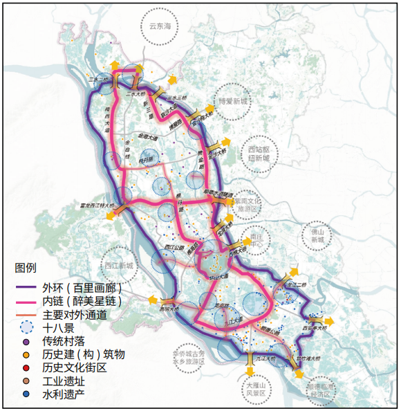 佛山环两江先行区是典型的城乡区域协调空间,拥有丰富的山川、水脉与文化资源,但面临镇村工业化带来的空间碎片化与协同难、短期开发行为与系统规划不足、审美单一与人文关怀不足等问题,需迈入“文化再造”阶段,以文化重塑特色城乡空间,构建人与自然和谐的循环经济模式。