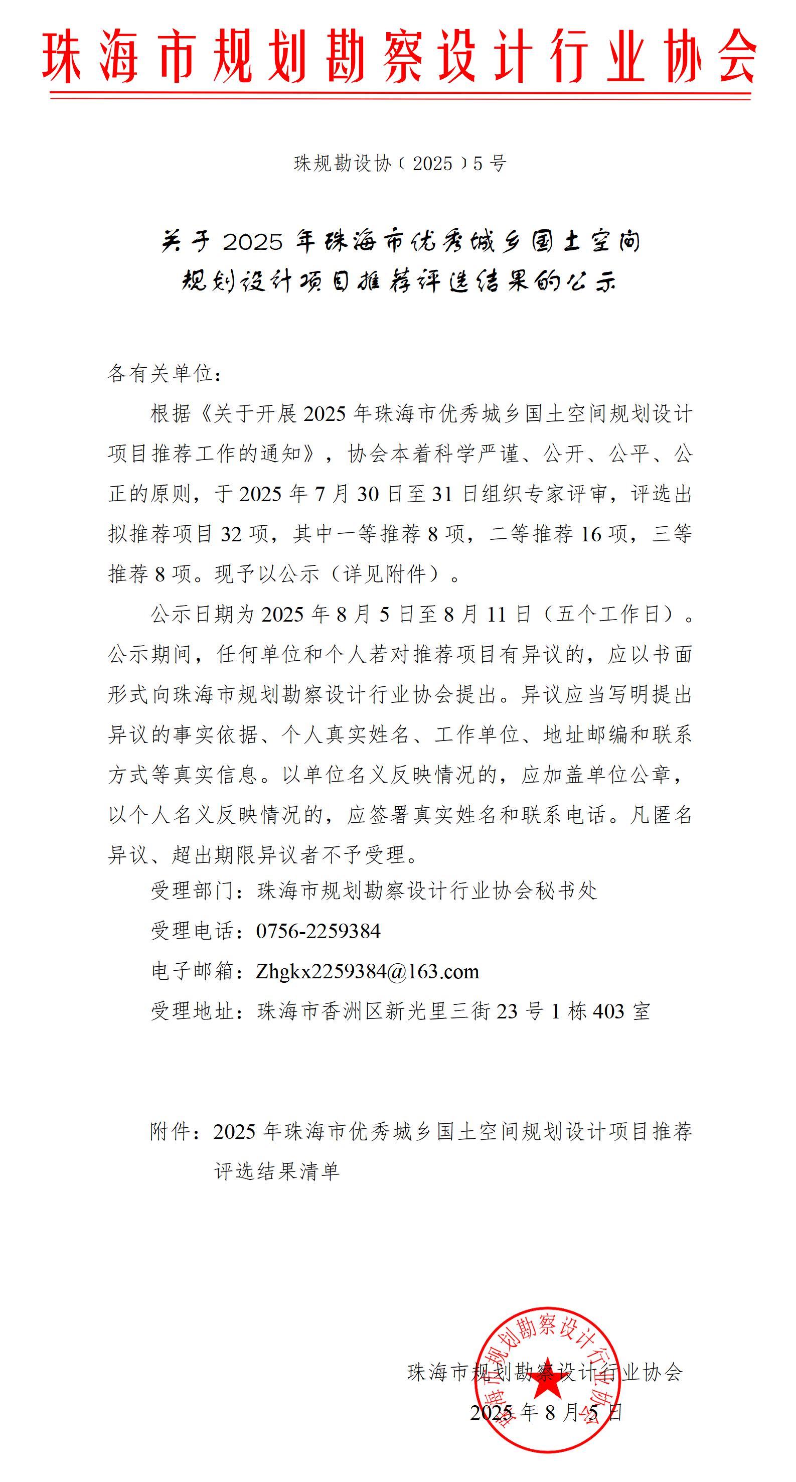 关于2025年珠海市优秀城乡国土空间规划设计项目推荐评选结果的公示